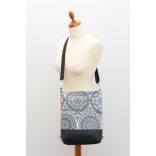 A Gina táska fekete vegánbőrből és szürke mandalás designer vastag vászonból varrt, a tetején zipzárral záródik.