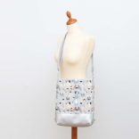 A Kayla táska ezüst vegánbőrből és világosszürke alapon fekete-szürke-fehér-drapp cuki kutyás mintás designer vastag vászonból varrt, a tetején zipzárral záródik.