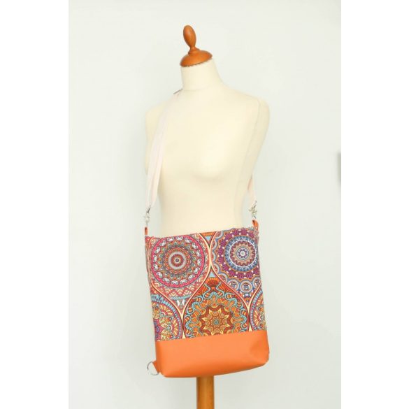 A Kylie táska narancs vegánbőrből és narancs-türkizkék-piros mandala mintás designer vastag vászonból varrt, a tetején zipzárral záródik.