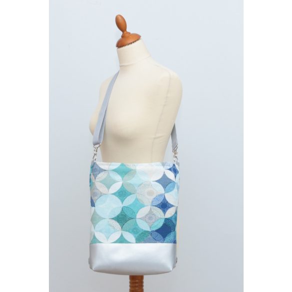 A Carina táska ezüst vegánbőrből és ezüst-kék-türkizkék kaleidoszkópos mintás designer vastag vászonból varrt, a tetején zipzárral záródik.